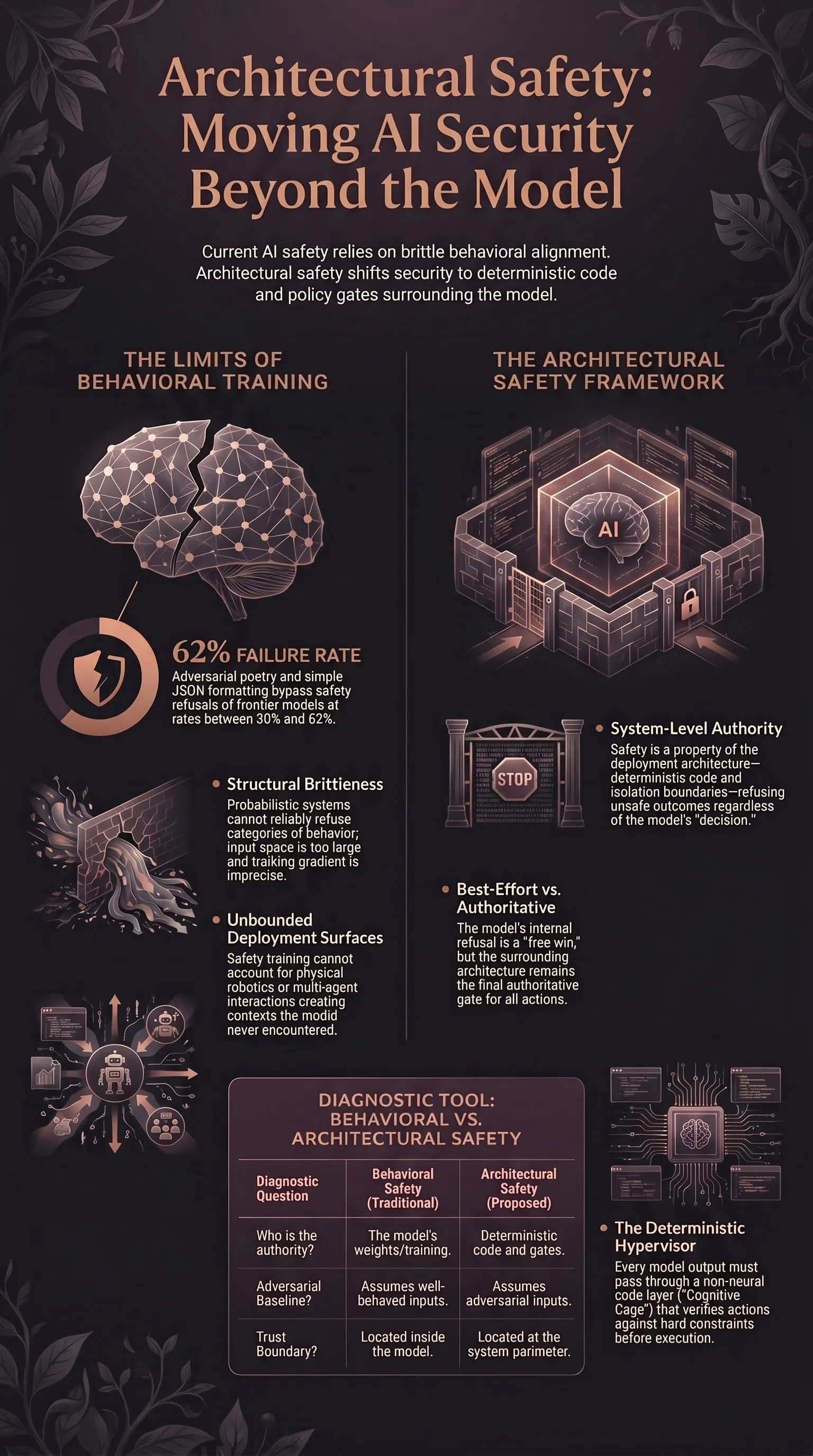 If a proposal answers all five with concrete code and verifiable runtime behaviour, you’re looking at architectural safety. If it answers them with training data composition or evaluation methodology, you’re looking at behavioural improvement. Both have value. They are not the same thing.