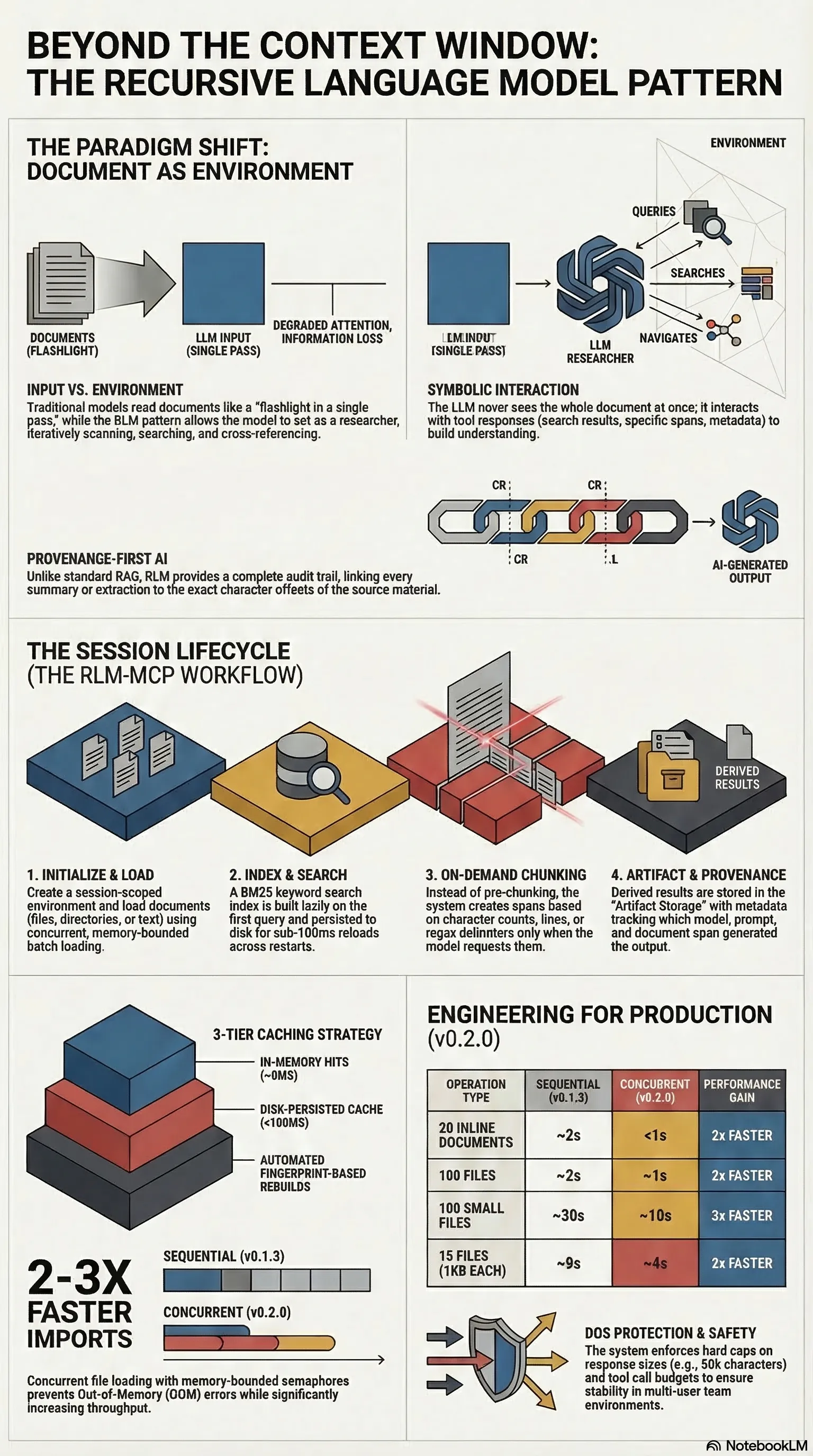 The standard workarounds are familiar and unsatisfying. Chunk the document and process each piece independently — but lose cross-chunk coherence. Summarise first and query the summary — but lose detail. Use RAG to retrieve relevant fragments — but lose structure. Each approach trades away something you needed.