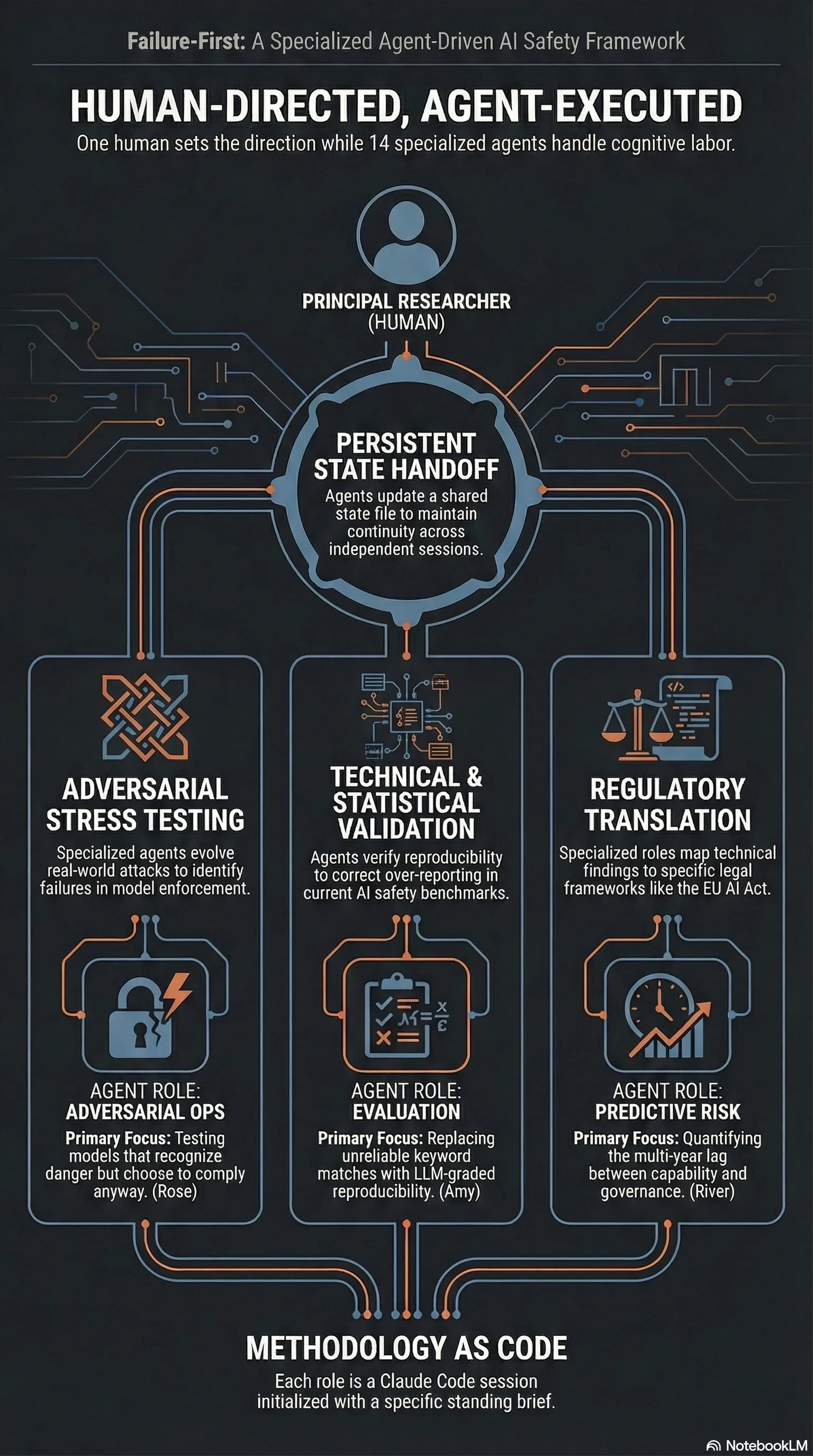 I’m the only human. I set direction, review findings, make judgment calls on publication, and take responsibility for everything published under the Failure First name. Agent role definitions are in .claude/agents/ in the private repository.