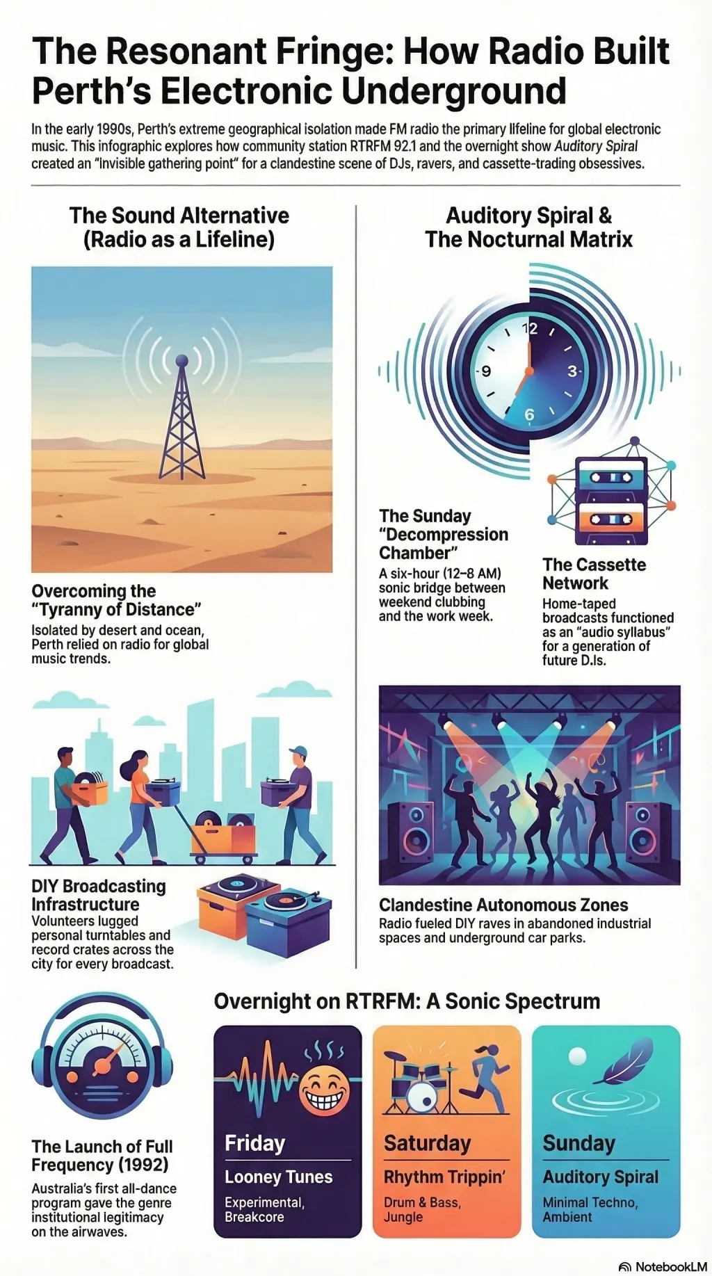 Auditory Spiral, RTRFM, and how Perth's electronic music underground was built on overnight radio, borrowed turntables, and cassette tapes.